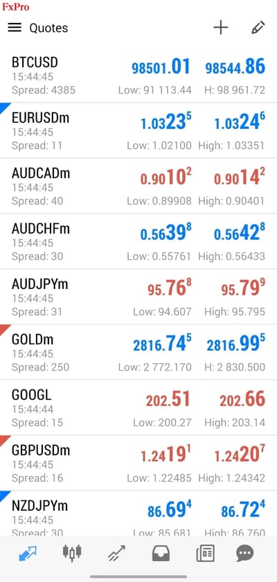 يسمح تطبيق الجوال بتصفية وتصفح مجموعة واسعة من منتجات الاستثمار بناءً على معايير مفضلة. تتضمن منصات FxPro وظيفة بحث فعّالة لمساعدة المتداولين على تحديد الأدوات والأدوات بسرعة.