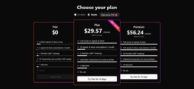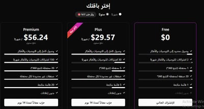 يوجد ثلاثة خيارات رئيسية: خطة مجانية (Free)، وخطة Plus، وخطة Premium. توفر الخطة المجانية ميزات محدودة مثل عدد محدود من التوصيات والأفكار، ومحفظة واحدة وقائمة متابعة واحدة.