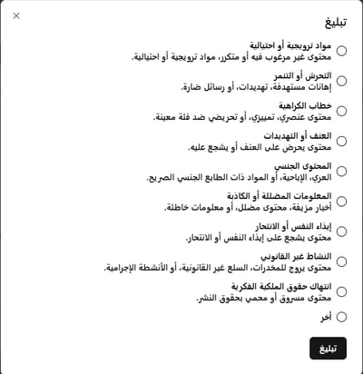 إذا لاحظت توصية أو تحليلاً تخالف شروط الاستخدام أو تنطوي على سلوك مريب، يمكنك الإبلاغ عنها مباشرة عن طريق الضغط على زر التنبيه الموجود بجانب أزرار التعليقات والمشاركة الموجودين في كل توصية. اختر سبب الإبلاغ من القائمة، واضغط على تبيلغ.